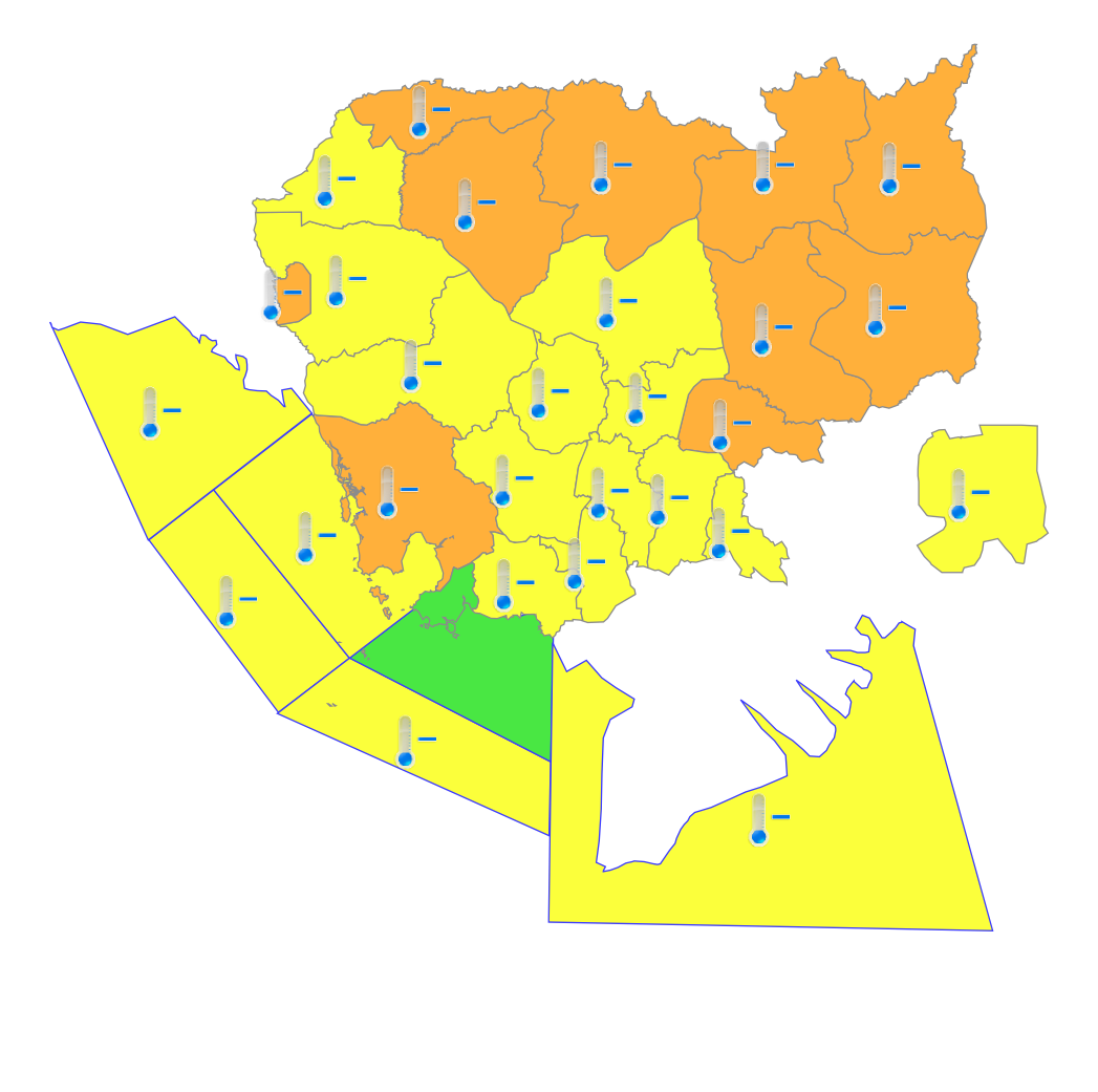 - ខេត្តកោះកុង តប៉ៃលិន ឧត្តរមានជ័យ សៀមរាប ព្រះវិហារ ស្ទឹងត្រែង រតនគិរី និងមណ្ឌលគិរី ក្រចេះ ត្បូងឃ្មុំ មានសីតុណ្ហភាពអប្បបរមាពី ១៦°C ទៅ ១៨°C។