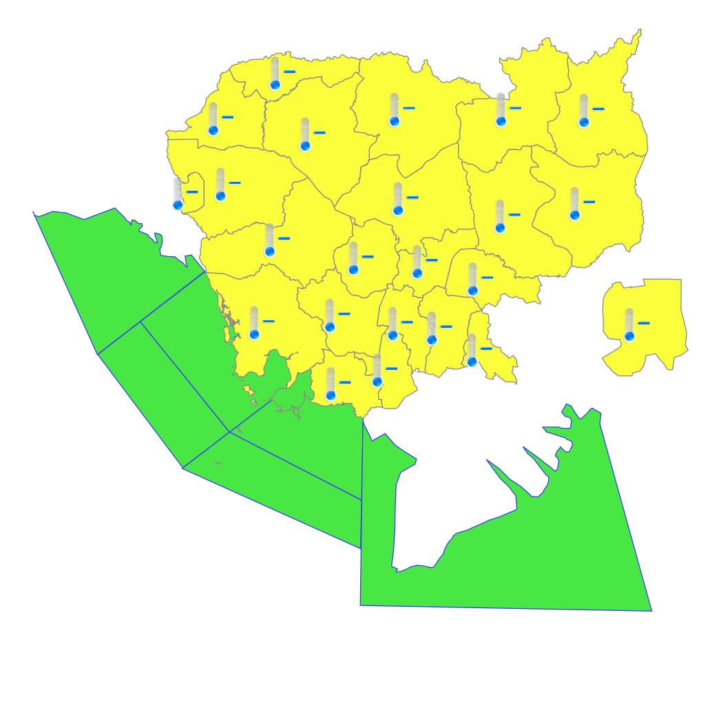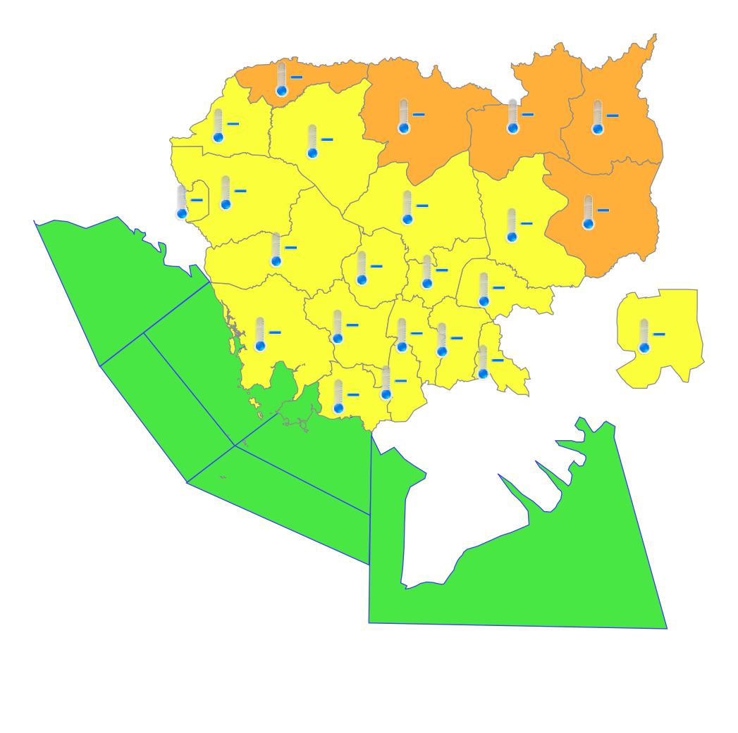 - Koh Kong, Pailin, Banteay Meanchey, Siem Reap, Battambang, Kampong Thom, Pursat, Kratie, Tbong Khmum, Kampong Cham, Kampong Chhnang, Prey Veng, Svay Rieng, Phnom Penh, Kandal, Kampong Speu, Takeo and Kampot will be with minimum temperature from 20°C to 22°C.