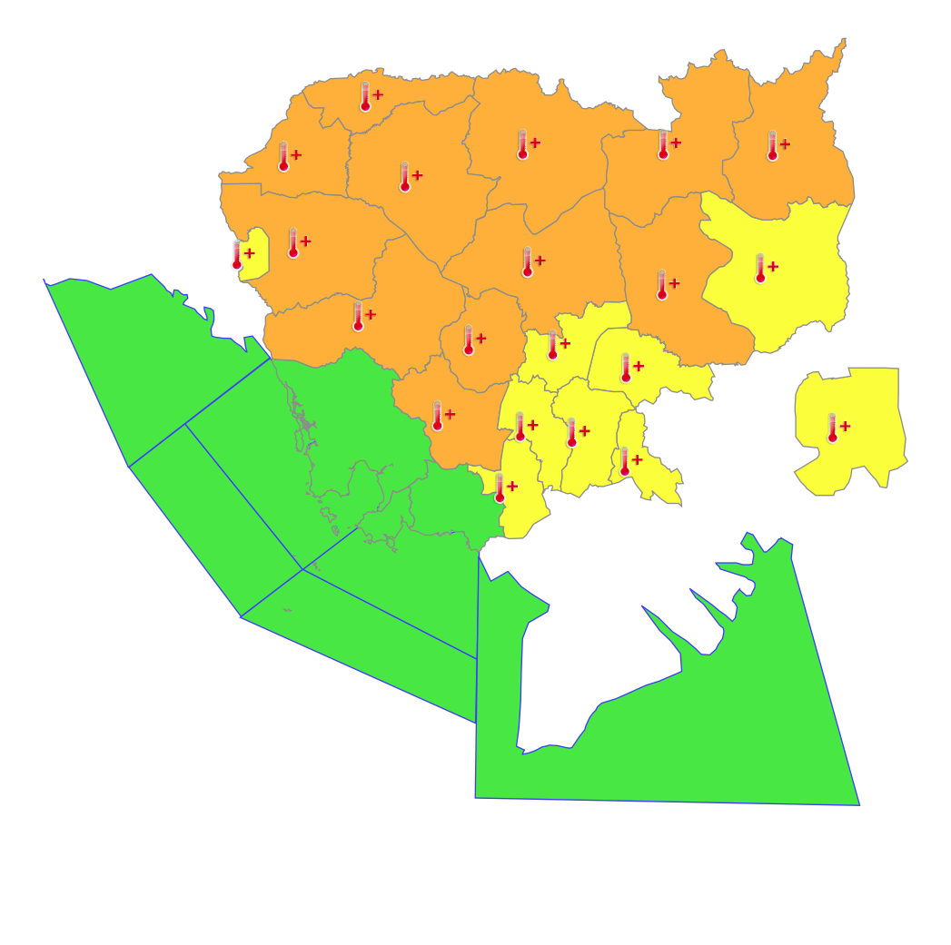 ខេត្តឧត្តរមានជ័យ បន្ទាយមានជ័យ ព្រះវិហារ សៀមរាប បាត់តំបង់ ពោធិ៍សាត់ កំពង់ធំ រតនគីរី ស្ទឹងត្រែង ក្រចេះ កំពង់ឆ្នាំង និងខេត្តកំពង់ស្ពឺ នឹងមានសីតុណ្ហភាពអតិបរមាពី ៣៧អង្សាសេ ដល់ ៤០អង្សាសេ។